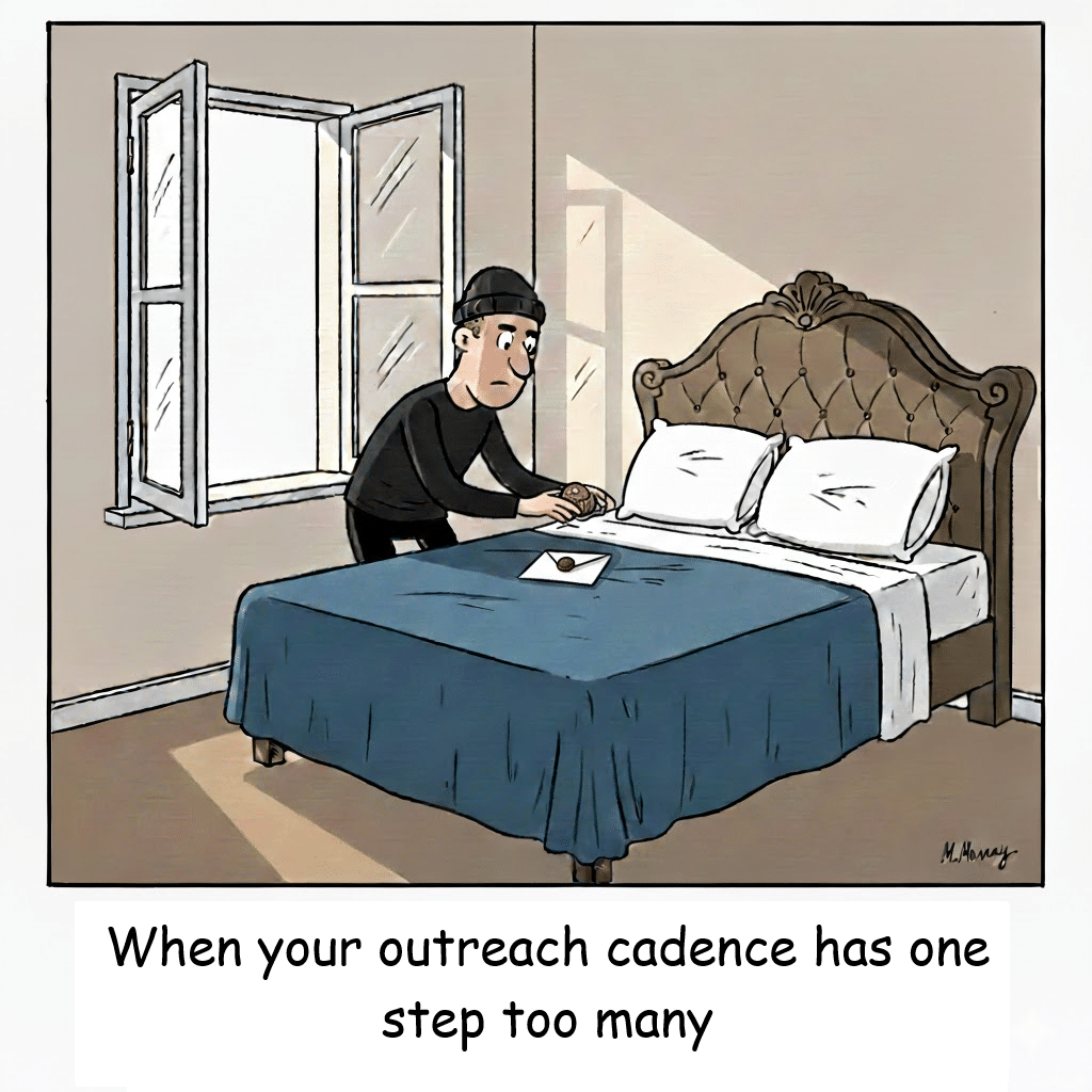 Outreach cadences can range from from professionally enthusiastic to straight up harassment. Twenty-one ‘touches’ in 14 work days might earn you a court issued restraining order.